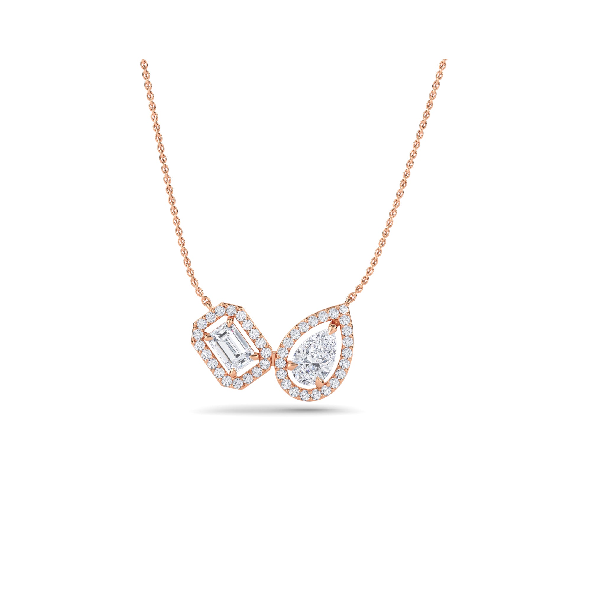 This stylish pendant features two stones surrounded by halos, creating a chic and sophisticated design. Ideal for gifting and adding a touch of contemporary flair to her collection, this pendant effortlessly enhances her style.